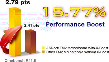Zaprojektowany dla inteligentnego podkręcania, ASRock X-Boost Technology jest w stanie uwolnić ukrytą moc Twojego CPU. Wystarczy nacisnąć "X" przy włączaniu komputera. X-Boost automatycznie przetak tuje komponenty dając nawet 15,77-procentowy wzrost wydajności! Z inteligentym X-Boost, podkręcania procesora może ograniczyć się tylko do naduszenia jednego przycisku.
