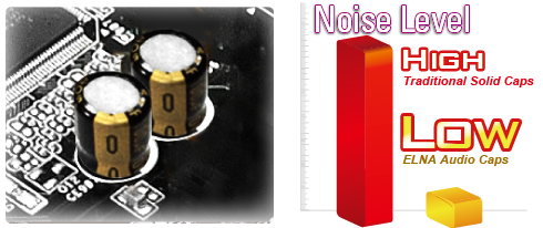 Kto powiedział, że wysokiej jakości dźwięk jest dostępny tylko na płytach głównych z najwyższej półki? ASRock umieścił kondensatory audio marki ELNA na standardowych i najtańszych płytach! W porównaniu z tradycyjnymi kondensatorami, prąd upływu w przypadku produktów firmy ELNA wynosi zaledwie 3uA. To kluczowa sprawa przy eliminacji poziomu szumów i dawaniu satysfakcji nawet najbardziej wybrednym audiofilom.