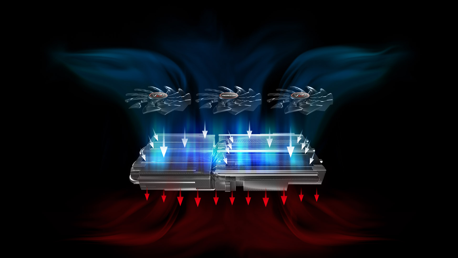 Niestandardowy wentylator osiowy ASRock zapewnia ulepszony przepływ powietrza, aby zoptymalizować chłodzenie nie tylko ze struktury pasków na każdej łopatce wentylatora, ale także z polerowanej powierzchni na spodzie. Kieruj przepływem powietrza, aby był bardziej regularny i szybki, aby zwiększyć wydajność chłodzenia dzięki żeberkom tnącym w kształcie litery V i otworom wentylacyjnym w kształcie litery V. Rury cieplne są skonsolidowane, aby zmaksymalizować kontakt między sobą, a także płyta bazowa GPU w celu zoptymalizowania rozpraszania ciepła. Dzięki wysokiej jakości konstrukcji radiatora na bazie miedzi, obszar bezpośredniego kontaktu z GPU zostałby zmaksymalizowany, aby skutecznie poprawić transfer ciepła.