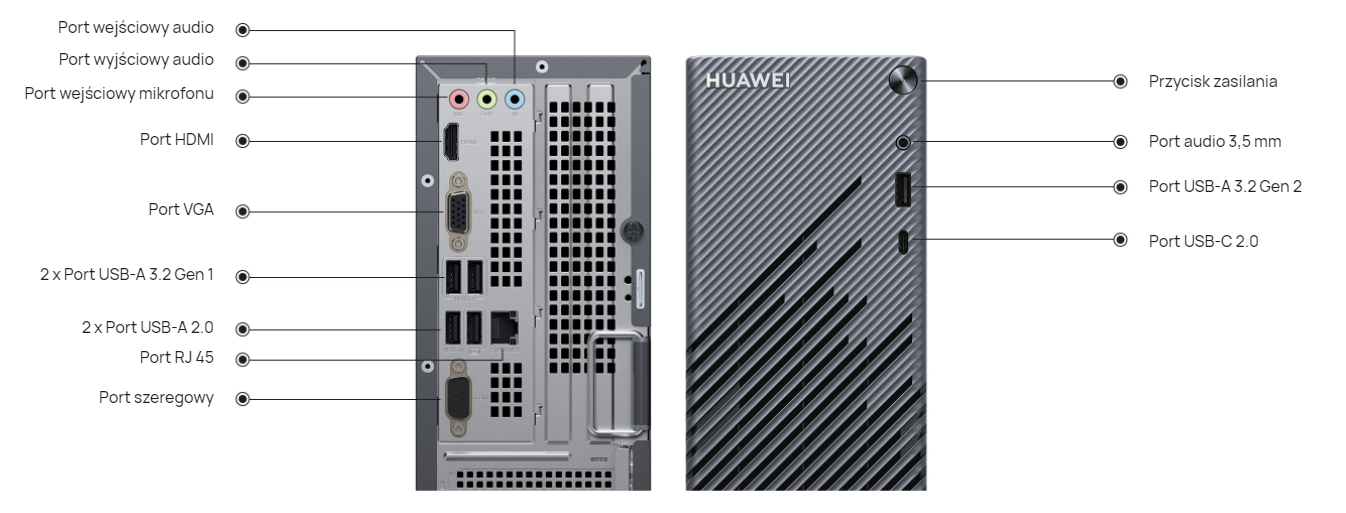 Odkrywaj nowe połączenia z bogactwem portów w HUAWEI MateStation S. Przednie gniazdo USB-C zapewnia wygodny dostęp do szybkiego ładowania smartfona3, a złącza tylne umożliwią podłączenie wielu urządzęń peryferyjnych.