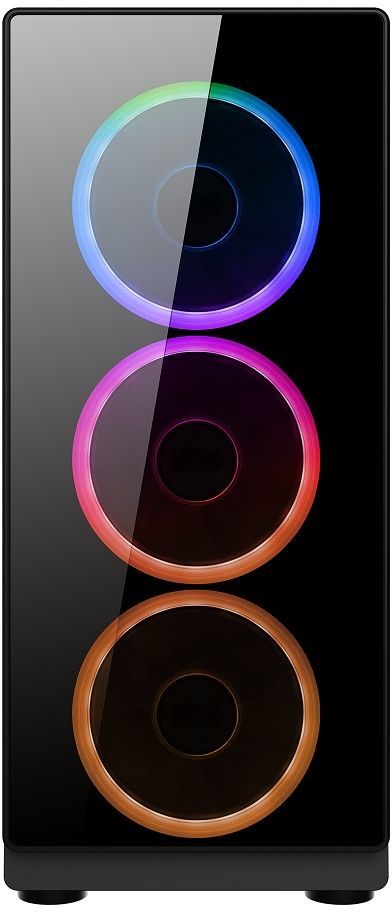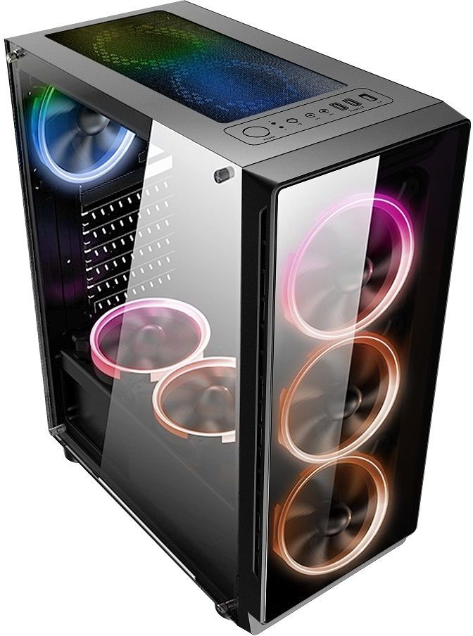 Bardzo dobrze wyposażona obudowa o swietnych parametrach wentylacji, 3 wentylatory RGB sterowane pilotem w cenie, panel przedni i boczny wykonany z przezroczystej plexi. Pozwala to na elegancka prezentacje podswietlonego zestawu zainstalowanego w srodku. Na górnej krawedzi eleganckiego panelu frontowego znajduje sie duzy przycisk zasilania, maly przycisk reset, dwa porty USB 3.0, oraz zestaw zlacz audio. Jeśli chcesz większą ilość wentylatorów, możesz dokupić na naszych aukcjach UPGRADE