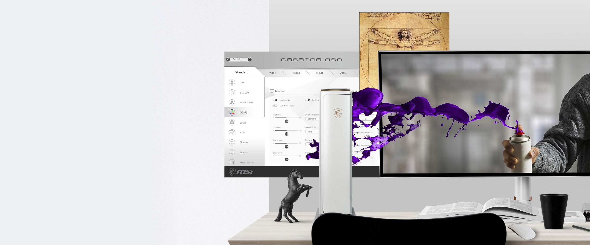 Dokładność odwzorowania kolorów i przestrzeń barw mają kluczowe znaczenie podczas tworzenia. Intuicyjnie zaprojektowana aplikacja MSI Creator OSD nie zawiedzie Cię nigdy pod tym względem. Creator OSD przenosi optymalizację na nowy, wyższy poziom, dzięki trybom kolorów, które oferują możliwość łatwej regulacji. Pomaga to znaleźć najbardziej odpowiednia i dokładną przestrzeń barw podczas codziennego tworzenia. Zobacz każdy szczegół dzięki monitorom z serii MSI Prestige i ciesz się zaletami aplikacji OSD Creator tak, aby każdy szczegół był tak żywy i realistyczny, jak tylko chcesz.