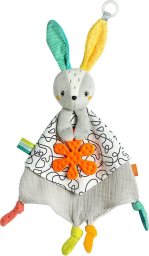 Ten wyjątkowy kocyk jest wyposażony w grzechotkę oraz szeleszczący papier, co zachęca maluchy do chwytania i zabawy. Długie uszy królika wydają dźwięki, co dodatkowo przyciąga uwagę dzieci, wspierając ich rozwój sensoryczny i motoryczny. Neonowy pomarańczowy gryzak ułatwia proces ząbkowania, co czyni ten produkt jeszcze bardziej atrakcyjnym dla najmłodszych.