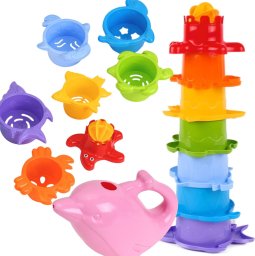 Zestaw do kąpieli od firmy TechnoK to morska piramida i konewka w kształcie delfina. Ten zestaw przyniesie dzieciom wiele radości podczas kąpieli i zamieni ją w zabawną i ekscytującą przygodę. Piramida składa się z siedmiu elementów o różnych kolorach i rozmiarach. Jednocześnie każdy element jest również ciekawym mieszkańcem morza : delfin, foka, krab, żółw, rozgwiazda i ryba. Wszystkie elementy można złożyć w piramidę od większej do mniejszej lub złożyć razem. Wymiary każdej figury dobierane są proporcjonalnie - największy "rekin" i najmniejsza "rozgwiazda". Kolory - jak tęcza, od czerwieni do fioletu. Na górnej figurze „rozgwiazdy” znajduje się młynek , który obraca się podczas nalewania wody. Przez sitka na dnie każdej formy woda „ucieknie z piramidy”. Elementy piramidy nadają się również jako kubeczki , a sitko na dole można wykorzystać jako stempel na piasku. Wielkość konewki jest specjalnie dostosowana do rączki małego dziecka. Zbieranie wody jest łatwe, ponieważ otwór znajduje się na górze i nie jest blokowany przez uchwyt. Zbuduj i zniszcz piramidę, naucz się kolorów, rozmiarów, kształtów, poznaj morskie życie i stawiaj pierwsze kroki w liczbach. Nalewanie wody na młynek i obserwowanie, jak się obraca, to prawdziwa fizyka. I wiele innych pomysłów, które wymyśli Twoje dziecko. Podczas zabawy dziecko rozwija: zdolności motoryczne, koordynację, pamięć, logikę, wyobraźnię. Cechy: zestaw jest wygodny do zabrania ze sobą na spacer, nie zajmuje dużo miejsca w wózku czy torbie, wymiary opakowania: 18x21cm, wiek: 12m+. Zabawka występuje w dwóch wariantach kolorystycznych konewki(niebieskim lub różowym). Produkt wydawany losowo.