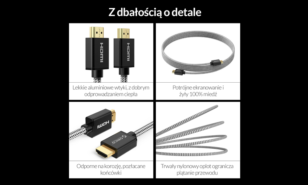 Standard HDMI 2.0 to skok jakościowy także w odtwarzaniu dźwięku. Przewód HDMI Orico obsługuje 32 kanały audio (8 obsługiwanych przez wcześniejszą wersję), zapewnia dźwięk stereo 7.1 oraz charakteryzuje się częstotliwością próbkowania aż 1536 kHz. Dźwięk jest nie tylko czysty, ale dzięki wsparciu dla Dolby Atmos, wyraźnie słyszymy jego głębię i przestrzeń.