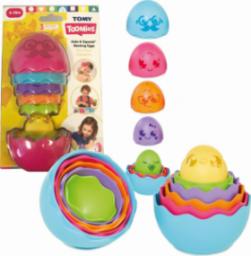 W zestawie znajdują się 4 kolorowe skorupki jajek z buźkami oraz piąta z kurczaczkiem. Można je ze sobą składać, wkładać mniejsze w większe i bawić się nimi w wodzie.