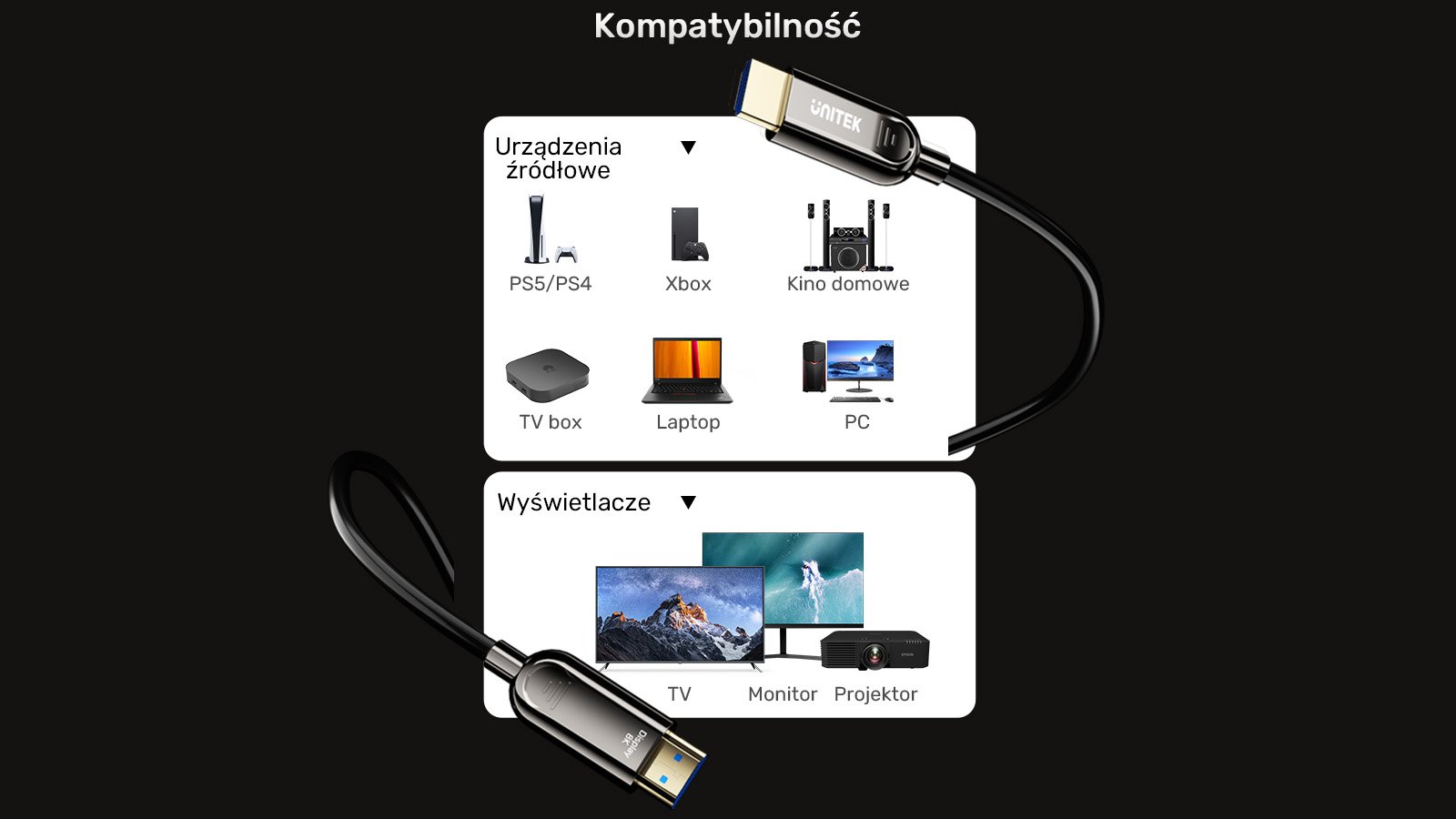 Najwyższa jakość obrazu UHD – kabel optyczny umożliwia przesyłanie obrazu w rozdzielczości 8K przy 60 Hz i 4K przy 120 Hz/144 Hz.