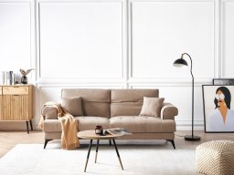 Sofa 3-osobowa SKIVE Lumarko to elegancki mebel, który doskonale wpasuje się w różne style wnętrz, od nowoczesnego po klasyczny. Jej jasnobrązowy kolor oraz minimalistyczny design sprawiają, że stanie się centralnym punktem każdego salonu, oferując jednocześnie wygodę i funkcjonalność.