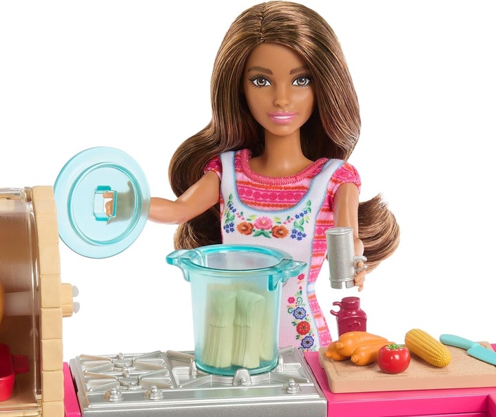 Z tym inspirowanym filmem „Barbie i Teresa Przepis na przyjaźń” zestawem Kuchnia Teresy z lalką Teresą, kuchnią i ponad 20 akcesoriami wyobraźnia dzieci może „upichcić” najróżniejsze przygody. Teresa może przygotowywać znane z filmu przepisy w kuchni z elementami do zabawy takimi jak kuchenka, piekarnik z obrotowym rożnem, „tamales” mieszczącymi się w garnku oraz zmieniającymi kolor „ciasteczkami”. Mali smakosze pokochają realistyczną zabawę w przyrządzanie „warzyw” i serwowanie przepysznych „dań”. Lalka Teresa jest ubrana, jak na szefową kuchni przystało, w fartuszek podarowany przez babcię. Fani i dzieci od 3 lat pokochają odtwarzanie filmowych scen i wymyślanie nowych przepisów na przygodę! Lalka nie stoi samodzielnie. Kolory i elementy dekoracyjne mogą się różnić.