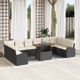 vidaXL 11-elementowy zestaw jadalny w ogrodzie z poduszkami z czarnego polirattanu i akacji