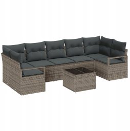 Zestaw sof ogrodowych vidaXL, składający się z 8 elementów, łączy w sobie wygodę, elegancję oraz funkcjonalność, co czyni go idealnym wyborem do relaksu i zabawy na świeżym powietrzu. Nowoczesny szary odcień oraz miękkie poduszki nadają mu stylowy wygląd, a ręcznie pleciony rattan wprowadza nutę luksusu do patio, balkonu czy ogrodu.