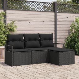 vidaXL Zestaw sof ogrodowych 4-częściowy z poduszkami czarny poli rattan, 2-osobowa sofa ogrodowa z przechowalnią i poduszkami czarny poli rattan