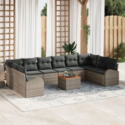 Zestaw sof ogrodowych vidaXL to stylowa propozycja dla tych, którzy pragną stworzyć przytulną przestrzeń do wypoczynku w ogrodzie lub na balkonie. Składający się z 11 elementów, w tym poduszek, zestaw został wykonany z wysokiej jakości polirattanu w odcieniu szarości oraz akacjowego drewna, co zapewnia zarówno atrakcyjny wygląd, jak i funkcjonalność. Dzięki modułowemu designowi, zestaw idealnie sprawdzi się podczas spotkań towarzyskich oraz chwil relaksu na świeżym powietrzu.