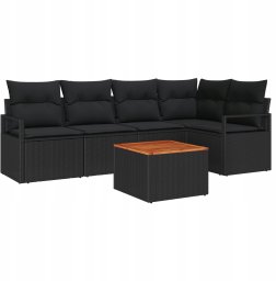 Zestaw 6-częściowy sofy ogrodowej z poduszkami czarny polirattan akacja, 2-osobowa sofa ogrodowa z miejscem do przechowywania i poduszkami czarny polirattan