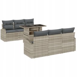 vidaXL Zestaw 7-częściowy sof ogrodowych z poduszkami jasnoszary poli rattan, 2-osobowa sofa ogrodowa z miejscem do przechowywania i poduszkami jasnoszary poli rattan