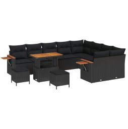 12-elementowy zestaw sofy ogrodowej z poduszkami czarny polirattan akacja, 3-elementowy zestaw do jadalni na świeżym powietrzu z poduszkami czarny polirattan akacja