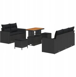 Zestaw 8 komponentów sofy ogrodowej z poduszkami czarny polirattan akacja, Zestaw 3 komponentów stołu ogrodowego z poduszkami czarny polirattan akacja