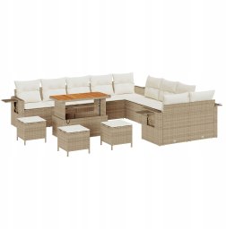 Zestaw narożników ogrodowych vidaXL 14-częściowy z poduszkami Beżowy Polirattan Akacja, Zestaw jadalny vidaXL 4-częściowy z poduszkami Beżowy Polirattan Akacja