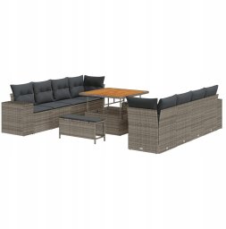 Zestaw ogrodowy 11-częściowy z poduszkami Szary Polirattan Akacja, Zestaw jadalny 3-częściowy z poduszkami Szary Polirattan Akacja