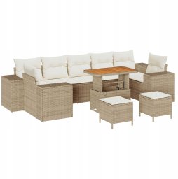vidaXL Zestaw sof ogrodowych 10 elementów z poduszkami Beżowy z polirattanu i akacji, Zestaw do jadalni na zewnątrz 3 elementy z poduszkami Beżowy z polirattanu i akacji