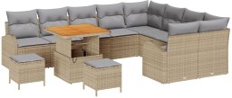 vidaXL 12-częściowy zestaw sof ogrodowych z poduszkami beżowy poli rattan akacja, 2-osobowa sofa ogrodowa ze schowkiem i poduszkami beżowy poli rattan, 3-częściowy zestaw jadalniany ogrodowy z poduszkami beżowy poli rattan akacja
