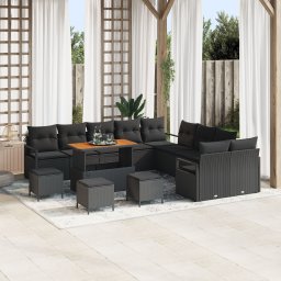 Ten zestaw sof ogrodowych z 14 elementami to perfekcyjne połączenie komfortu i stylu, tworząc przytulny kącik dla przyjaciół i rodziny na świeżym powietrzu. Smukły czarny wygląd z akcentami drewna akacjowego dodaje klasę Twojemu patio, balkonowi czy ogrodowi podczas letnich spotkań.