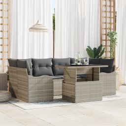 7-częściowy zestaw sof ogrodowych z poduszkami jasnoszary z polirattanu, Dwuosobowa sofa ogrodowa z miejscem na przechowywanie i poduszkami jasnoszary z polirattanu