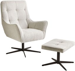 Obrotowy fotel z podnóżkiem. Stylowy zestaw, składający się z obrotowego fotela i podnóżka, zachęca do relaksu i długich godzin spędzonych na lekturze. Tapicerowany wysokiej jakości, miękką tkaniną, doskonale komponuje się zarówno z nowoczesnymi, jak i klasycznymi wnętrzami. Funkcja obrotowa fotela zapewnia wygodę i swobodę ruchu, a czarne metalowe nogi dodają mu stabilności i subtelnego, retro charakteru. Podnóżek doskonale sprawdzi się jako mały stolik boczny lub komfortowe podparcie dla stóp.