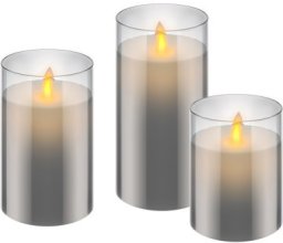 z funkcją timera i knotem 3D, zasilana bateryjnie, ciepła biel (2700 K) Tradycyjna elegancja prawdziwych świec woskowych spotyka się z nowoczesną, bezpieczną technologią oświetleniową: Dzięki 3D knotowi i woskowej osłonie zestaw świec tworzy ciepłą, harmonijną atmosferę prawdziwych świec – bez wypalania się, sadzenia lub stwarzania zagrożenia pożarowego. Stylowa dekoracja kolacji przez cały rok i magia Adwentu w okresie Bożego Narodzenia – idealna atmosfera na każdą okazję. - Stylowe znicze w trzech różnych rozmiarach zapewniające ciepłe światło świec z naturalnym płomieniem w szarym szkle – całkowicie elektryczne i całkowicie bezpieczne - Idealny jako dekoracja do salonu lub jadalni, jako lampka nocna, dekoracja na imprezę lub jako dekoracja świąteczna w sezonie zimowym - Może być drapowana pojedynczo lub łączona z innymi elementami w celu stworzenia dekoracji stołu i nakrycia - Z włącznikiem/wyłącznikiem i funkcją timera dla 6-godzinnego interwału świetlnego (powtarza się co 24 godziny) - Światła LED są bezpiecznym rozwiązaniem oświetleniowym bez zagrożenia pożarowego dla ludzi i zwierząt – odpowiednie dla wszystkich obszarów, w których prawdziwe świece są zbyt niebezpieczne lub niedozwolone - Wymiary (wys. x szer.): 10 x 7,5 cm, 12,5 x 7,5 cm, 15 x 7,5 cm, każda świeczka LED zasilana 3 bateriami AAA (brak w zestawie) - Wskazówka: Chronić przed wysokimi temperaturami i silnym nasłonecznieniem, aby nie dopuścić do stopienia świec