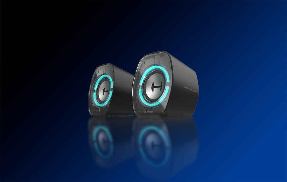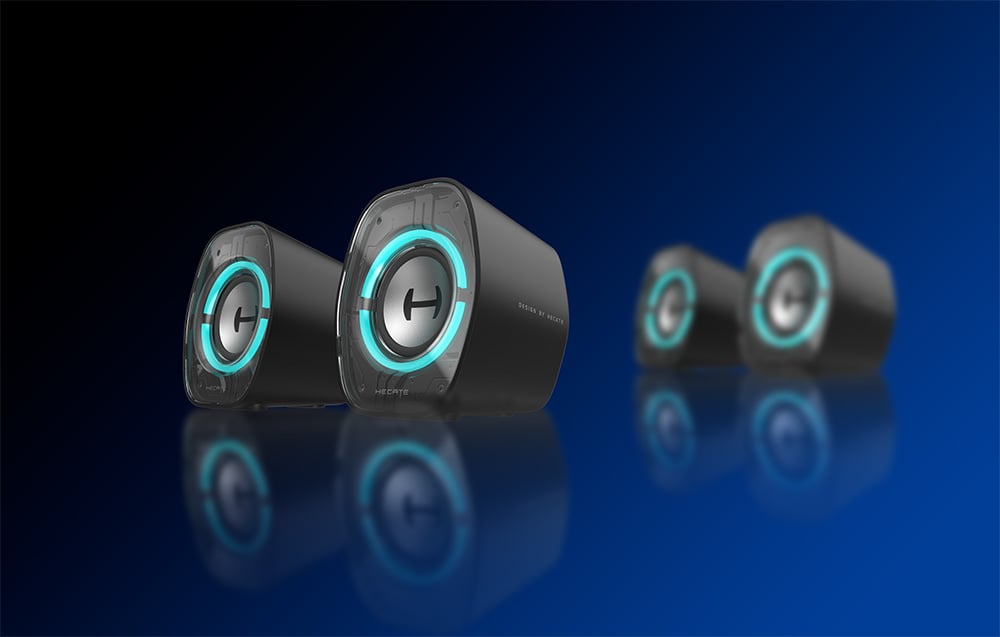 W projekcie obudowy zadbano o każdy detal. Delikatne pochylenie konstrukcji o 10 stopni poprawia kierunkowość dźwięku i redukuje jego odbicia od biurka, co pozytywnie wpływa na słyszalność wysokich tonów. Przezroczysta pokrywa z efektem lustrzanego tłoczenia nadaje futurystycznego wyglądu, a gumowe, antypoślizgowe podkładki gwarantują stabilność.