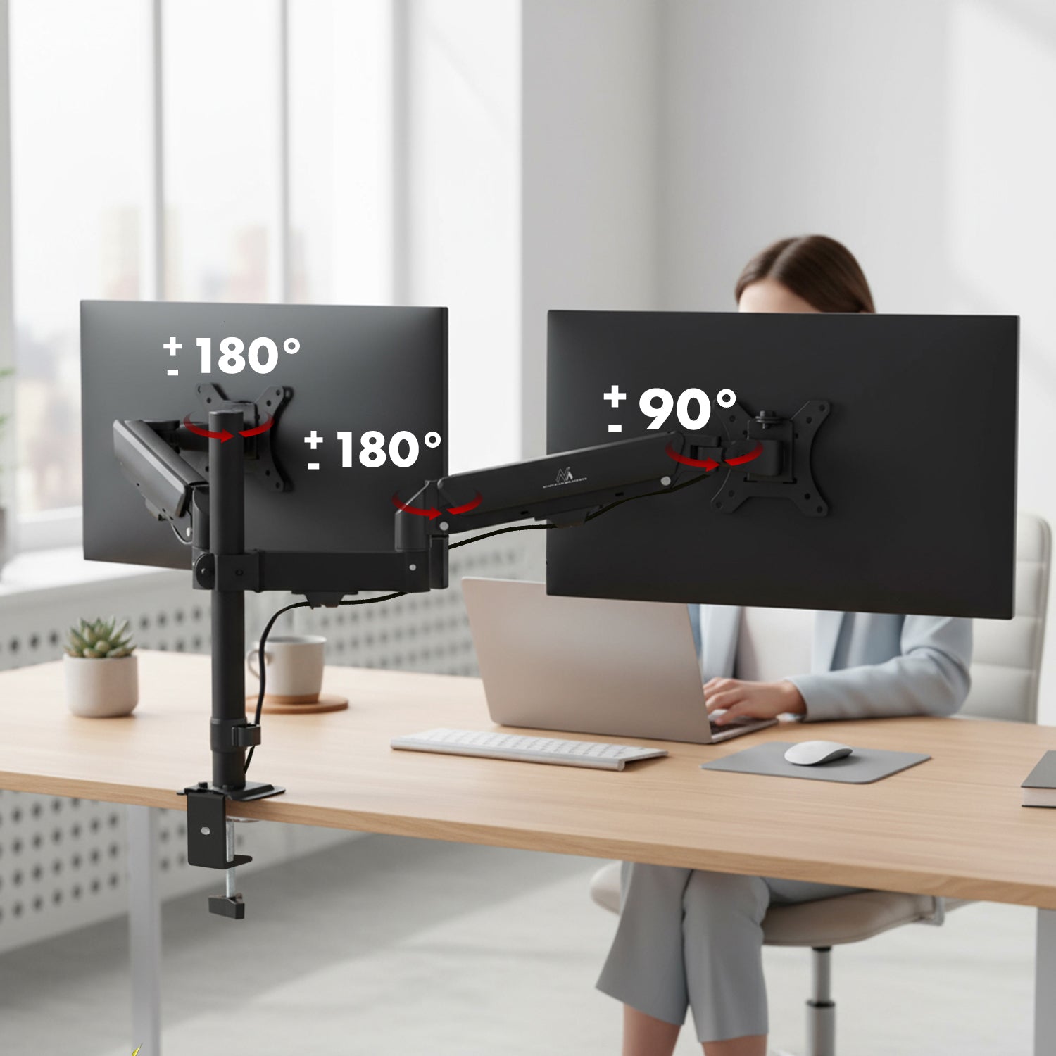 Każde z ramion uchwytu wyposażone jest w sprężynę gazową, która pozwala na lekką i płynną regulację wysokości monitora. Dzięki temu jednym ruchem dłoni możesz unieść lub opuścić ekran, dostosowując jego położenie do własnych potrzeb. Mechanizm gazowy zapewnia stabilność i utrzymuje monitor dokładnie tam, gdzie go ustawisz, bez opadania czy drgań. To rozwiązanie, które znacząco poprawia ergonomię i komfort codziennej pracy przy dwóch ekranach.