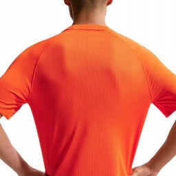 Model w kolorze pomarańczowym, znanym jako Safety Orange, wyróżnia się na tle innych ubrań sportowych. Dodatkowe akcenty w kolorze czarnym nadają mu nowoczesny i stylowy wygląd, który z pewnością przyciągnie uwagę. Koszulka nie posiada nadruku, co sprawia, że jest uniwersalna i łatwa do zestawienia z innymi elementami garderoby.