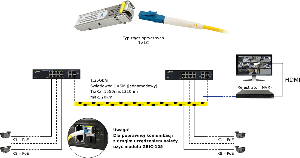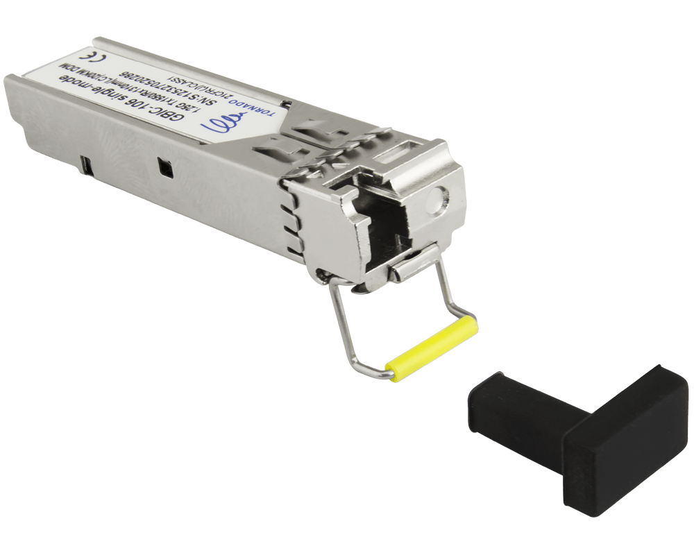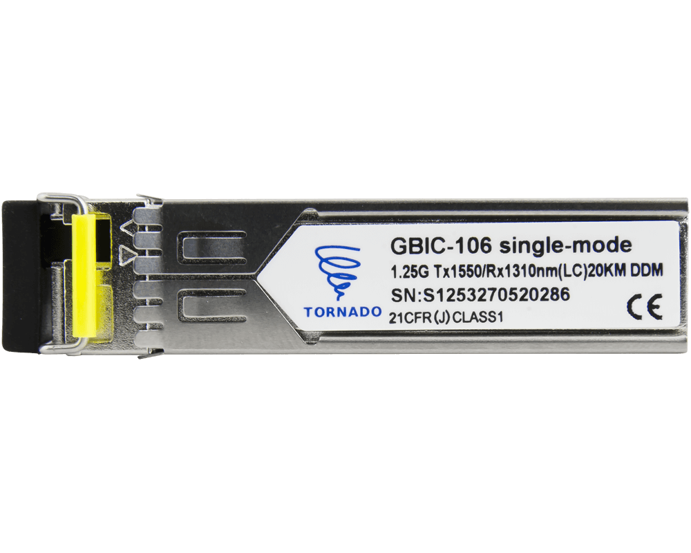Moduły SFP (Small Form-factor Pluggable) popularnie nazywane GBIC (Gigabit Interface Converter) to moduły zamieniające sygnał elektryczny na sygnał optyczny.Wkładka GBIC-106 Tornado to moduł przeznaczony do transmisji światłowodem jednomodowym (SM) na odległość do 20km. Długość fali TX 1550nm, długość fali RX 1310nm, prędkość transmisji 1,25Gb/s. Moduł posiada gniazdo typu LC z systemem blokady zatrzaskowej zabezpieczający przed przypadkowym wyciągnięciem złącza.