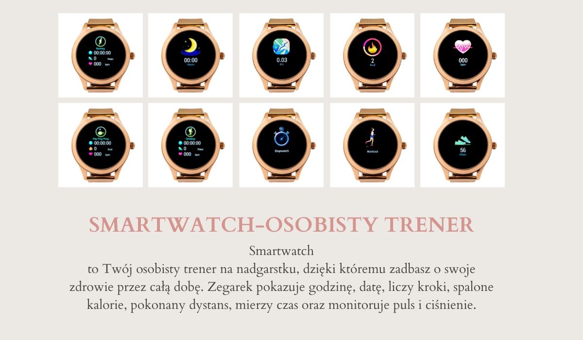 Bardzo kobiecy i elegancki smartwatch oprócz wielu przydatnych funkcji, spełni się także jako dodatek do codziennego stroju każdej nowoczesnej kobiety. Wszystko za sprawą designu, który jest bardzo wyjątkowy i dodaje elegancji do codziennego wyglądu. Posiada dotykowy ekran, który wyposażono w opcję personalizacji tarczy. Łączność Bluetooth pozwala na prostą synchronizację zegarka z telefonem.