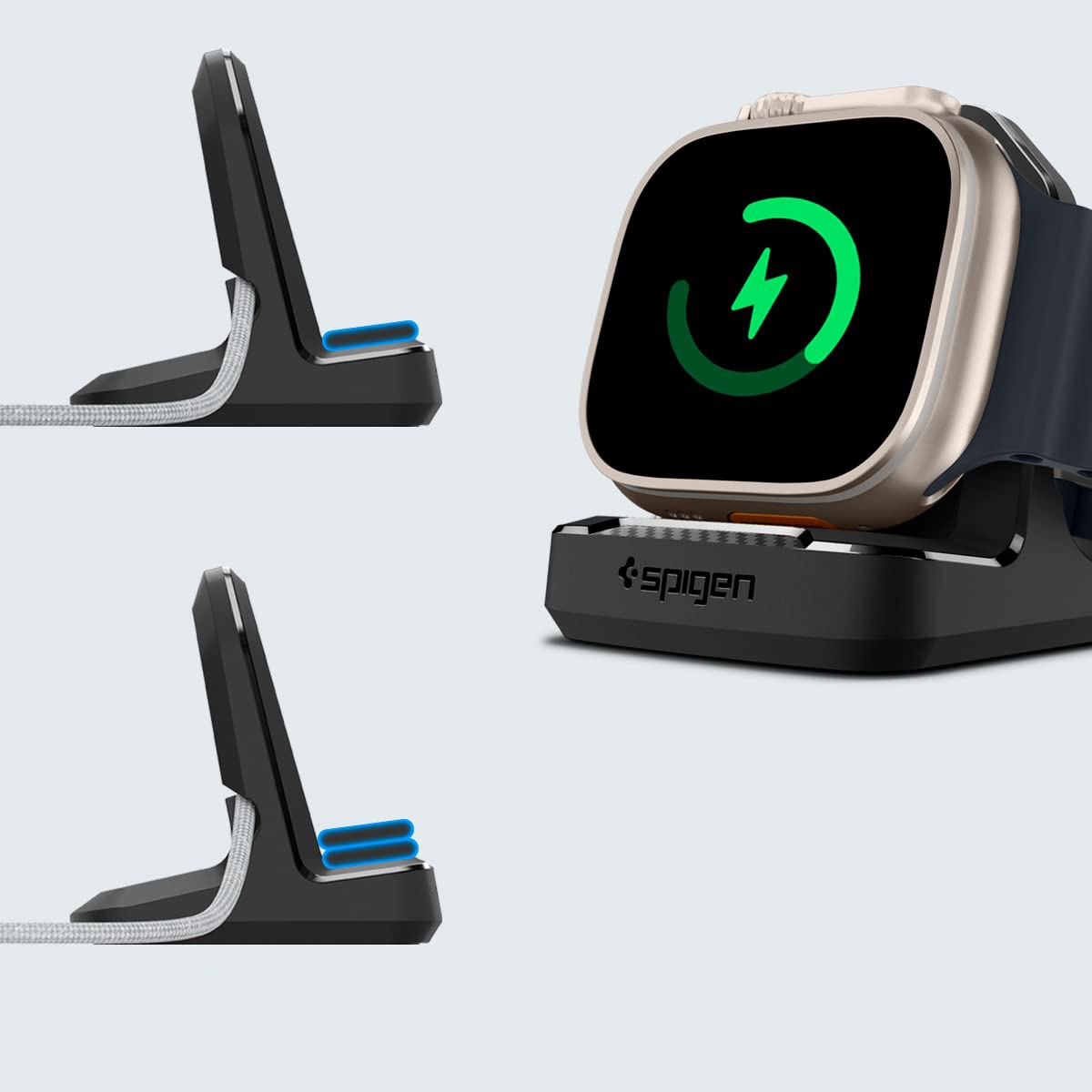 Stojak Spigen, który pomoże Ci uporać się z nieporządkiem na stanowisku ładowania dzięki dedykowanym wycięciom pod Twoje oryginalne okablowanie od Apple Watch.