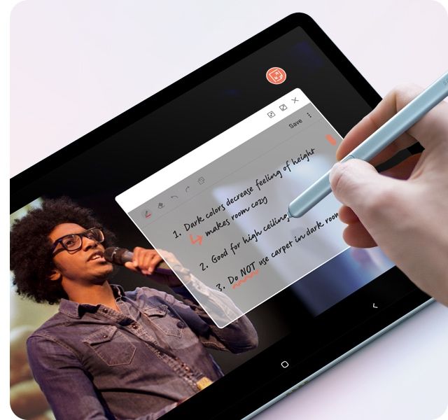 Rewelacyjna konstrukcja obudowy Galaxy Tab S6 pozwoliła na idealne zintegrowanie rysika S Pen – wystarczy umieścić go w zagłębieniu na tylnej części obudowy. Rysik S Pen nie tylko magnetycznie przymocuje się do tabletu, ale też od razu rozpocznie się proces jego ładowania, a dzięki temu będzie gotowy do użycia, gdy tylko zajdzie taka potrzeba. Rysik S Pen do Galaxy Tab S6 nie jest zwyczajnym dodatkiem do tabletu. Z jego pomocą zanotujesz wszelkie ciekawe pomysły i to bez wyłączania oglądanych materiałów wideo. Służy on również do zdalnego sterowania tabletem dzięki wykorzystaniu łączności Bluetooth. Co ważne, rysik S Pen został wyposażony w zupełnie nowe rozwiązanie S Pen Air Actions, które umożliwia sterowanie tabletem przy pomocy gestów dłonią. Jeśli zechcesz, możesz używać rysika S Pen również do szkicowania i rysowania. To bardzo precyzyjne narzędzie, które rozpoznaje aż 4096 poziomów nacisku, co pozwala na precyzyjne odwzorowanie detali i wygodę rysowania, jaką można porównać z klasycznym pędzlem. Przekonaj się, jakie to wygodne.