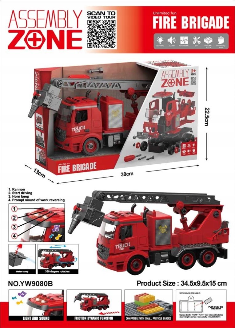 Ta interaktywna straż pożarna dla dzieci od 3. roku życia zapewni im mnóstwo frajdy i zabawy. Zestaw zawiera śrubokręt z wymiennymi końcówkami, który umożliwia rozkręcenie pojazdu. Wóz strażacki posiada napęd na przednie koła, a na dachu znajdują się dwa mrugające światła oraz przyciski funkcyjne, które uruchamiają odgłosy alarmu, zapłonu pojazdu, cofania i klaksonu. Wysięgnik wozu strażackiego jest ruchomy i można go podnosić, opuszczać i wysuwać manualnie. Dodatkowo może obracać się o 360 stopni. Zbiorniczek z wodą, po napełnieniu, pozwala na wypuszczenie strumienia wody po naciśnięciu przycisku na końcu węża strażackiego. Zabawka działa na baterie typu 3 x AG13 (w zestawie).