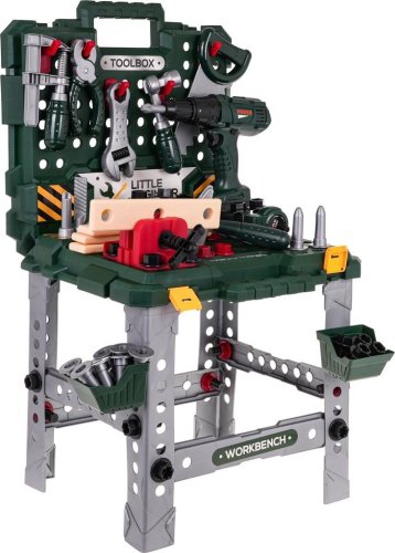 | Bogato wyposażony zestaw narzędziowy 2 w 1 z interaktywną wiertarko-wkrętarką dla dzieci od 3-go roku życia. Zestaw wykonany został z najwyższej jakości plastiku i składa się z 98 elementów. Z części konstrukcyjnych zestawu, ułożyć możemy stół warsztatowy lub walizkę na narzędzia. W zestawie znajduje się wkretarko-wiertarka na baterie, faktycznie wkręcająca i wykręcająca, a podczas pracy wydająca odgłosy charakterystyczne dla tego urządzenia. Imadło dołączone do zestawu rozsuwane jest manualnie. W zestawie znajdują się także: piła ręczna, młotek, obcęgi, klucz francuski, ścisk, klucz do kół, miarka, elementy do wkręcania oraz mnóstwo śrub, nakładek i kołków rozporowych. Wkretarko-wiertarka zasilana jest bateriami typu 2 x AA 1,5 V (brak w zestawie).