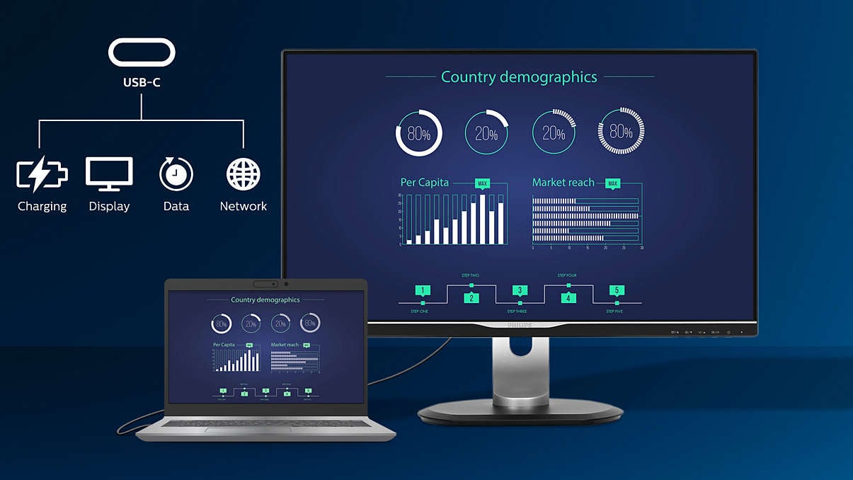 Ten monitor Philips ma wbudowaną stację dokującą USB typu C z funkcją zasilania. Smukłe, dwustronne złącze USB-C umożliwia łatwe dokowanie z użyciem jednego przewodu. Dzięki niemu możesz podłączyć wszystkie urządzenia peryferyjne, np. klawiaturę, mysz i przewód Ethernet RJ-45 do stacji dokującej monitora. Wystarczy podłączyć ten monitor do notebooka za pomocą pojedynczego kabla USB-C, aby oglądać filmy wideo o wysokiej rozdzielczości oraz szybko przesyłać dane i jednocześnie zasilać lub ładować notebooka.