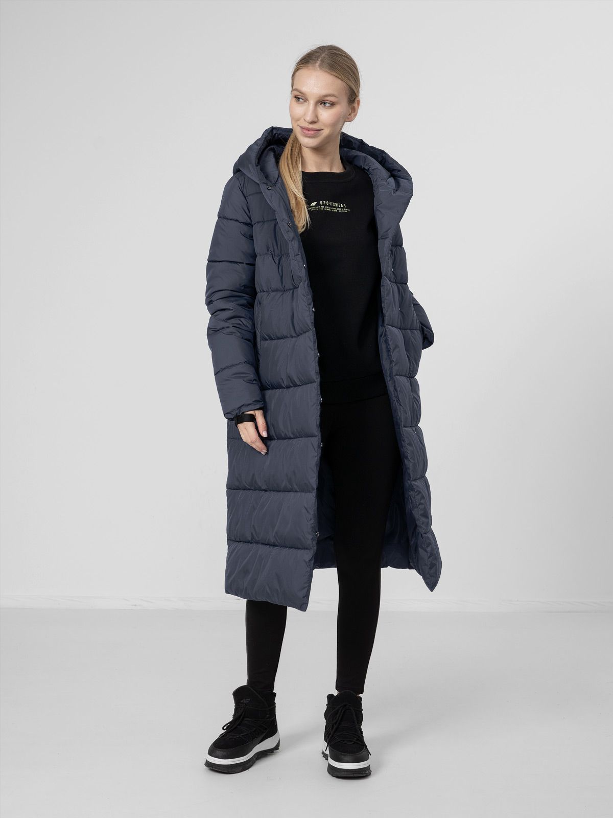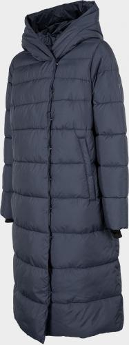 Długa kurtka dla kobiet marki 4F sprawdzi się doskonale w zimowe dni. Wysoki komfort cieplny oraz wysoka objętość są wynikiem syntetycznego wypełnienia.