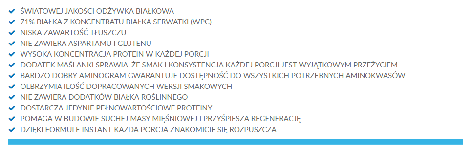 Wysokiej jakości odżywka białkowa na bazie koncentratu białek serwatki z dodatkiem naturalnej maślanki. Dzięki jej zawartości smak i konsystencja jest wręcz rewelacyjna – wystarczy tylko dodać wody by uzyskać gęsty i niezwykle smaczny shake proteinowy. Idealne uzupełnienie diety wo pełnowartościowe białko.