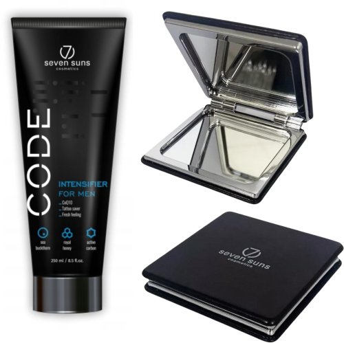 7suns Code Przyspieszacz Dla Mężczyzn 250ml + Podwójne Lusterko . 7suns Code Przyspieszacz Dla Mężczyzn 250ml Prawdziwie męski przyspieszacz opalania o silnych właściwościach regeneracyjnych i rewitalizacyjnych. Połączenie masła Shea i arganowego z koenzymem Q10, to nie tylko antyoksydacyjna bomba, ale przede wszystkim odżywienie i regeneracja skóry. Składniki mineralne będą wspierać utrzymanie optymalnego poziomu nawilżenia skóry, a wszystko to okraszone świeżym zapachem cytrusów ze szczyptą wanilii. Kluczowe składniki & korzyści: Formuła Biotanning – aktywuje proces melanogenezy. Rokitnik - opóźnia procesy starzenia, wspiera regenerację skóry, poprawia jej koloryt. Miód - uelastycznia, wygładza i odżywia skórę. Aktywny węgiel - pochłania nadmiar wilgoci. Mango - doskonale nawilża i regeneruje skórę. CoQ10 – jest silnym antyoksydantem, działa przeciwzmarszczkowo, chroni przed UVA. Masło Shea & masło arganowe – głęboko odżywiają skórę i regenerują ją, chronią przez wysoką temperaturą i wolnymi rodnikami. Składniki mineralne - uzyskane w procesie fermentacji drożdży, w obecności jonów miedzi, żelaza, cynku i magnezu, dodatkowo nawilżają skórę i wspierają jej odnowę komórkową. Formuła Multi-Oli⁷ - przywraca zdrowy blask. Formuła HydroBalance – mieszanina składników silnie nawilżających, chroniących przed nadmierną utratą wody w skórze. Formuła SkinFirming – przyczynia się do utrzymania zdrowego wyglądu skóry poprzez poprawę jej elastyczności. Formuła TattooSaver – chroni kolor i połysk tatuaży. Zapach: świeży, orientalny Kolor masy: biały 7suns Podwójne Lusterko Z Logo Rolujący się podkład, rozmazana szminka odbijający na powiece tusz do rzęs… tyle rzeczy może się wydarzyć. Chcesz mieć wszystko pod kontrolą? Wrzuć to małe lusterko do torebki, kieszeni lub plecaka. Dzięki solidnemu wykonaniu będzie niezawodnym wsparciem przez naprawdę długi czas.