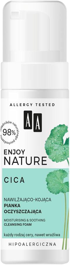 AA ENJOY NATURE to idealnie skomponowana naturalna pielęgnacja, celująca w potrzeby Twojej skóry! Czerpiąc z mocy skutecznych ekstraktów roślinnych, stworzyliśmy unikalną, hipoalergiczną recepturę Nawilżająco-kojącej pianki oczyszczającej, która zapewni efektywne oczyszczenie, nawilżenie i ukojenie skóry. Postaw na naturę i ciesz się piękną oraz zdrową cerą!