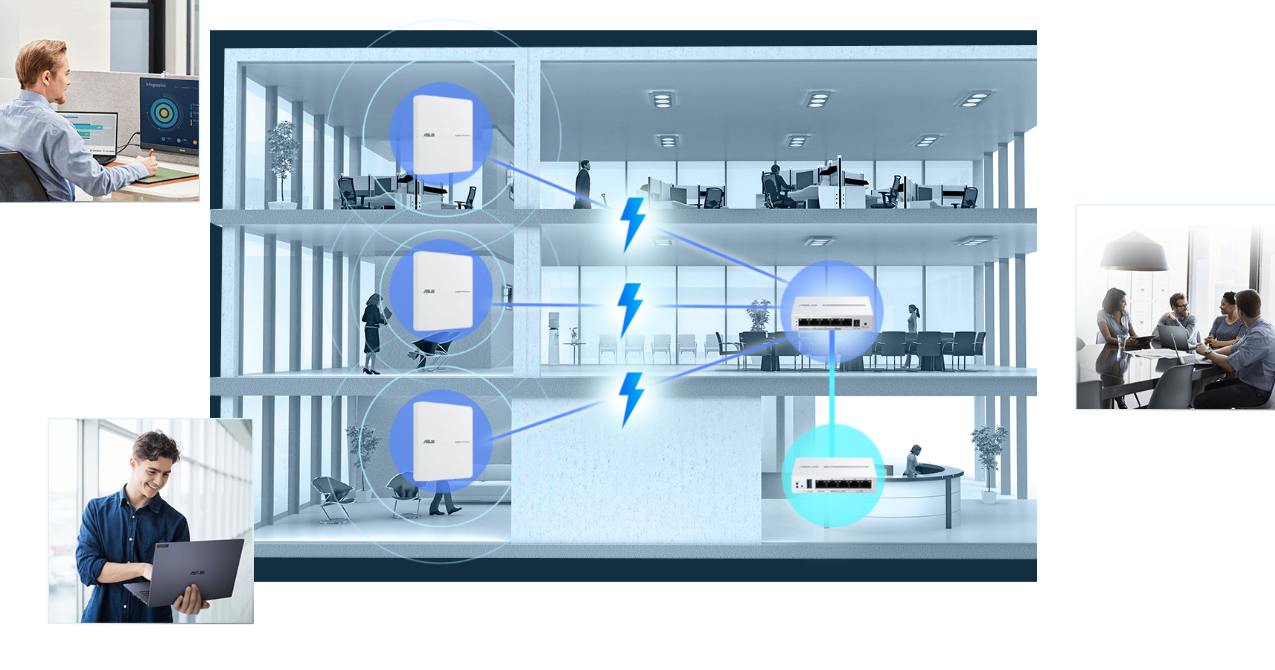 Produkty sieciowe ASUS ExpertWiFi są zaprojektowane z myślą o łatwej skalowalności, aby było możliwe dopasowanie ich do różnych scenariuszy zastosowań w niewielkich i średniej wielkości firmach. Integrując produkty z serii ExpertWiFi, możesz rozszerzyć zasięg swojej sieci firmowej i uzyskać dostęp do pełnego pakietu funkcji oprogramowania ExpertWiFi – które usprawnią Twoją działalność biznesową. Produktów ExpertWiFi można także używać w połączeniu z routerami z możliwością rozbudowy ASUS AiMesh.