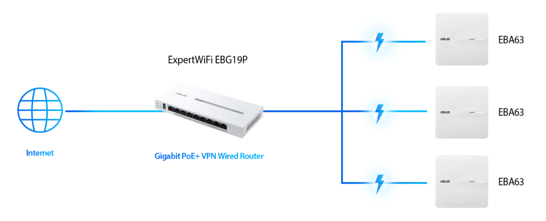 ASUS ExpertWiFi EBA63 zapewnia niezawodną łączność w różnych zastosowaniach biznesowych, oferując elastyczne opcje zasilania przez PoE (Power over Ethernet) i zasilaczem sieciowym. Podłączając do przełącznika PoE lub routera przewodowego PoE, możesz zapewnić zarówno zasilanie, jak i transmisję danych przez pojedynczy kabel Ethernet.