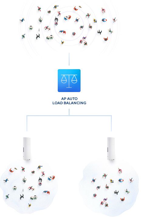 W sytuacji, gdy wiele punktów dostępowych znajduje się w tej samej lokalizacji, Nuclias Cloud automatycznie równoważy obciążenie między nimi bez konieczności użycia dodatkowego sprzętu lub konfiguracji. Dzięki temu sieć Wi-Fi działa optymalnie przez cały czas.