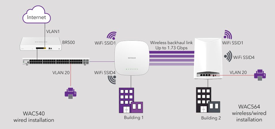 Możliwość połączenia wielu obszarów bez użycia kabli z urządzeniem NETGEAR WAC540 lub WAC564.