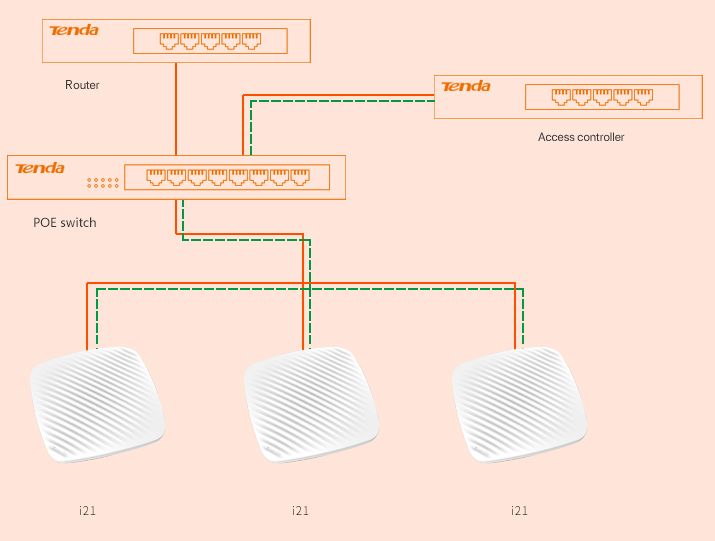 i21 to punkt dostępowy Wi-Fi zaprojektowany specjalnie przez firmę Tenda dla środowiska o wysokiej gęstości użytkowników, takiego jak przedsiębiorstwo, bar, kawiarnia itd. Obsługuje dwa pasma 2,4 i 5 GHz, technologię MIMO i OFDM, a także zapewnia prędkość transmisji bezprzewodowej na poziomie 1167 Mb/s. Posiada dwie anteny MIMO 2,4 GHz i dwie 5 GHz, obsługuje schemat regulacji mocy, dzięki czemu użytkownicy mogą regulować moc nadawczą zgodnie z rzeczywistymi potrzebami. i21 wspiera zasilanie 802.3af PoE i DC. Może być zarządzany przez wszystkie kontrolery dostępu Tenda.
