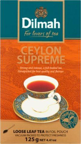 Dilmah Ceylon Supreme Tea (czyli Najlepsza Cejlońska) to kwintesencja herbaty cejlońskiej – kompozycja herbat z wybranych plantacji skrywająca ducha Rajskiej Wyspy. Daje napar aromatyczny, o głębokiej barwie oraz pełnym smaku – wyrazisty i mocny, ale nie za mocny. To właśnie smak i aromat, jaki oferuje Ceylon Supreme, rozsławił ponad 100 lat temu.