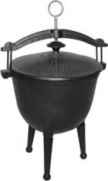 Kociołek myśliwski; wykonanie w całości z żeliwa - odlew maszynowy; wyposażony w zamykaną, zakręcaną pokrywę, nóżki demontowalne; do pieczenia i gotowania na ognisku; pojemność 4,5 litra